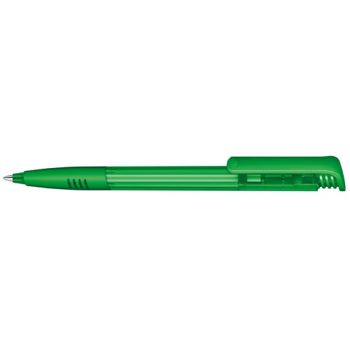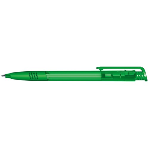 Stylo à bille rétractable avec corps en plastique transparent et clip en plastique brillant et grip souple.