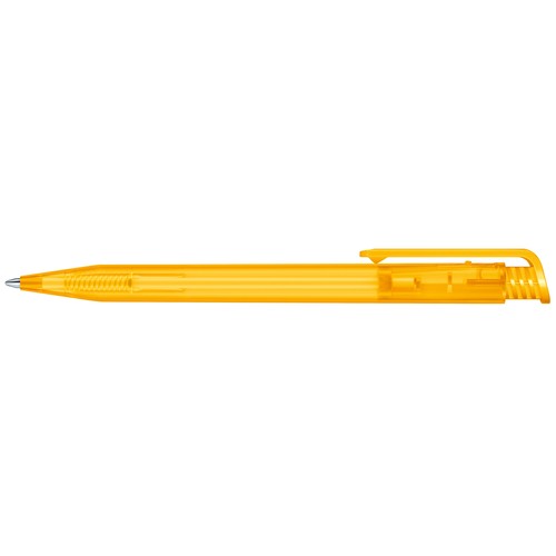 Stylo à bille rétractable avec corps en plastique aspect givré et clip en plastique brillant.