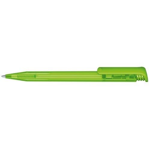 Stylo à bille rétractable avec corps en plastique aspect givré et clip en plastique brillant.