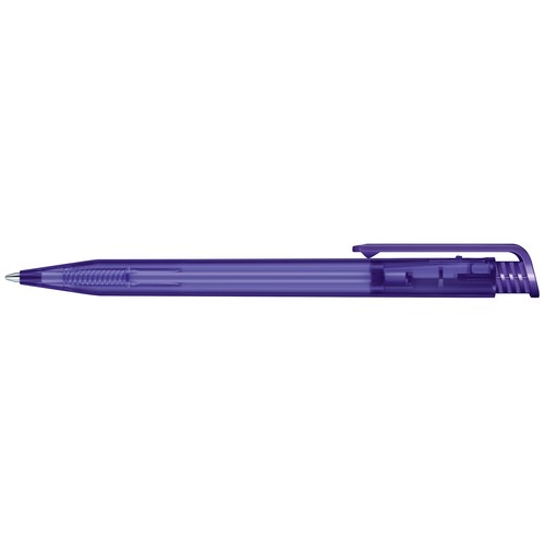 Stylo à bille rétractable avec corps en plastique aspect givré et clip en plastique brillant.