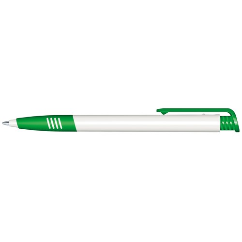 Stylo à bille rétractable avec corps en plastique blanc et clip et grip souple de couleur.