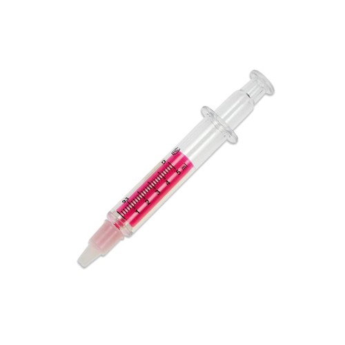 Surligneur en forme de seringue, transparent. La couleur indique la couleur d'écriture.