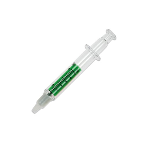 Surligneur en forme de seringue, transparent. La couleur indique la couleur d'écriture.
