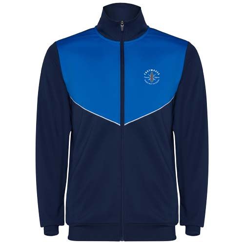 Survêtement en tissu léger et élastique. Veste avec couleur contrastée et finitions cousues sur la poitrine. Col montant avec coutures contrastées. Fermeture à glissière centrale sur le devant. Poches latérales. Poignets et taille côtelés 2x2. Pantalon avec ceinture élastique et cordon de serrage. Pièce latérale contrastée avec finition cousue. Ourlet zippé.