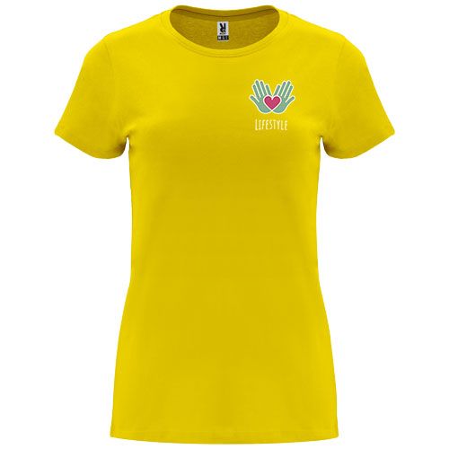 T- shirt ajusté à manches courtes pour femme. Col rond côtelé 1x1. Coutures recouvertes renforcées au col. Étiquette détachable.