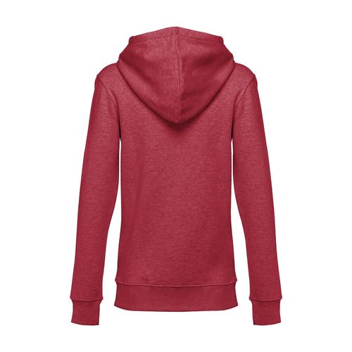 Sweatshirt pour femme en 50% coton et 50% polyester (320 g/m²) avec intérieur molleton. La capuche est doublée et possède une fermeture à cordon de serrage. Dans la zone avant, il y a deux poches marsupiales avec fermeture zippée plastique protégée. Poignets et taille côtelés. Tailles: S, M, L, XL, XXL