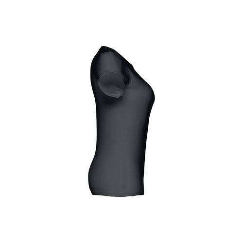 T- shirt ceinturé pour femme en maille jersey 100% coton (190 g/m²) avec fil de coton cardé (couleur 183: 90% coton/10% viscose). Contient un col en jersey fin avec un ruban de propreté en satin. Pièce coupée et cousue avec double surpiqûre sur les manches et le bas. Tailles: S, M, L, XL, XXL