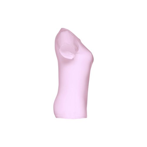 T- shirt ceinturé pour femme en maille jersey 100% coton (190 g/m²) avec fil de coton cardé (couleur 183: 90% coton/10% viscose). Contient un col en jersey fin avec un ruban de propreté en satin. Pièce coupée et cousue avec double surpiqûre sur les manches et le bas. Tailles: S, M, L, XL, XXL