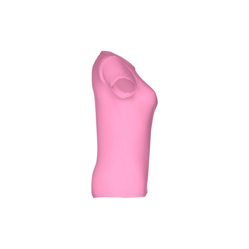 T- shirt ceinturé pour femme en maille jersey 100% coton (150 g/m²) avec fil de coton cardé (couleur 183: 90% coton/10% viscose, couleur 196: 98% coton/2% viscose). Contient un col fin en jersey double avec un ruban de renfort en satin. Pièce coupée et cousue avec double couture sur les manches et le bas. Tailles: S, M, L, XL, XXL