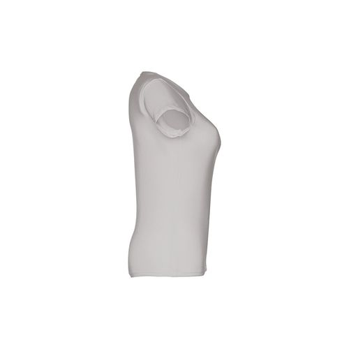 T- shirt ceinturé pour femme en maille jersey 100% coton (150 g/m²) avec fil de coton cardé (couleur 183: 90% coton/10% viscose, couleur 196: 98% coton/2% viscose). Contient un col fin en jersey double avec un ruban de renfort en satin. Pièce coupée et cousue avec double couture sur les manches et le bas. Tailles: S, M, L, XL, XXL