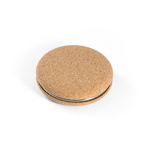 Miroir de poche, double faces, en liège, avec fermeture magnétique. Livré sous pochette papier Le produit étant fabriqué à partir de matériaux naturels, la couleur du produit ainsi que le résultat de l'impression peuvent varier d'un produit à l'autre. ø73 x 20 mm