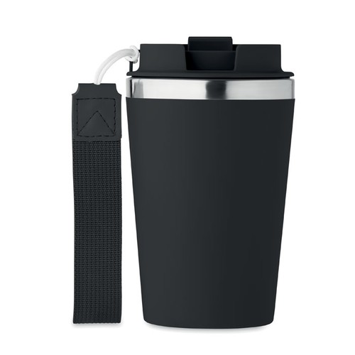 Gobelet à double paroi en acier inoxydable recyclé (90 % d'acier inoxydable recyclé et 10 % d'acier inoxydable) avec couche extérieure en PP et bracelet en RPET. Capacité : 350 ml.