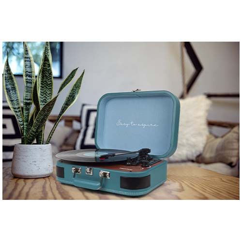 Tourne- disque vinyle et lecteur de musique avec Bluetooth® 5.0, USB, TF et radio FM. Numérisez le vinyle au format WAV via l'entrée USB et la fente TF. Il dispose d'une sortie audio RCA et est livré avec une paire d'écouteurs. Il comprend une aiguille rubis pour faire jouer délicatement des disques. Design en forme de mallette. Le tourne- disque peut être relié à un appareil mobile via Bluetooth® pour utiliser la fonction haut- parleur.
