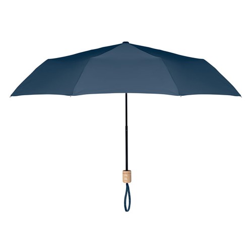 Parapluie pliable de 21'', attributs en pongé 190T RPET,mât et baleines en métal plaqué noir et manche en bois. Ouverture et fermeture manuelles. Pochette individuelle.
