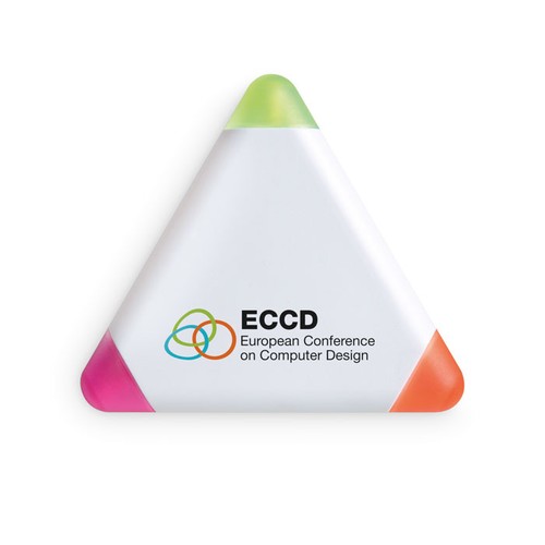Surligneur en ABS de forme triangulaire. Trois couleurs d'encre : jaune, fuchsia et orange.