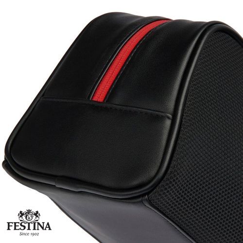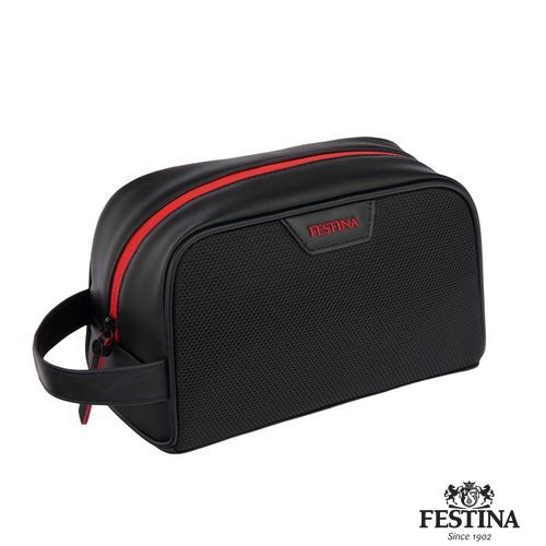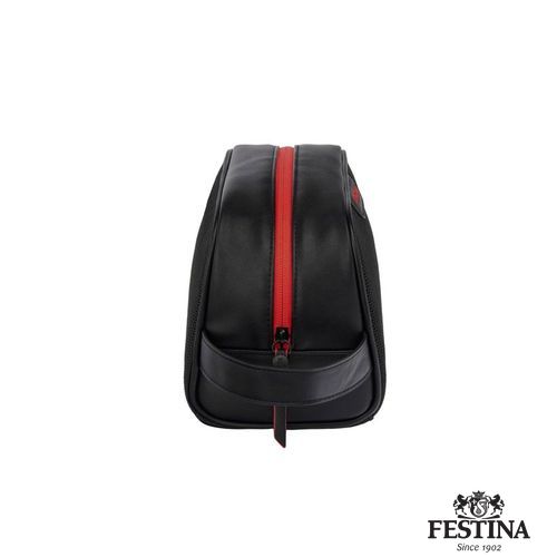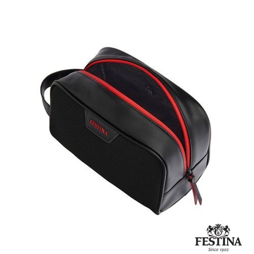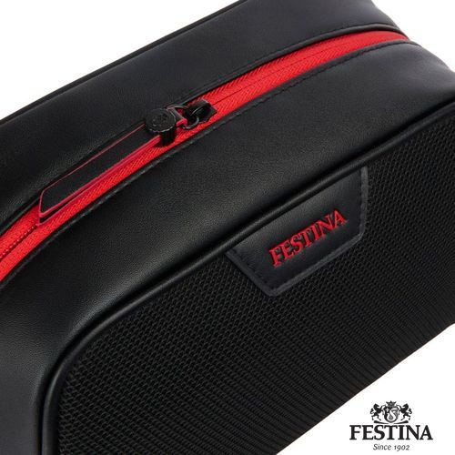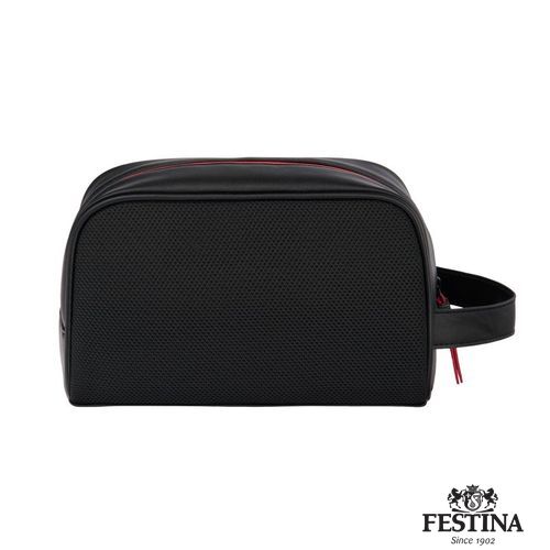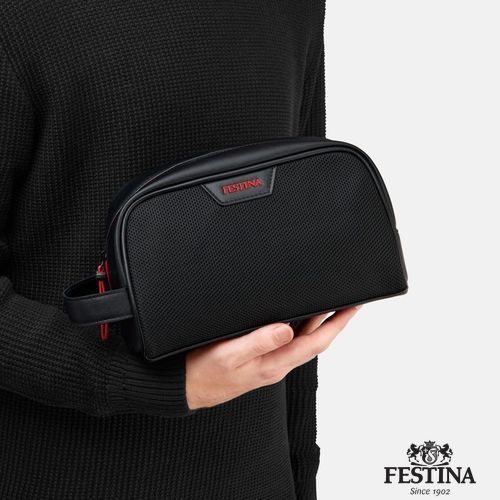 La pochette à cosmétiques "Black Edition" de Festina est une fusion parfaite entre design épuré et praticité. Fabriquée en cuir végétal noir mat, elle présente des accents innovants en maille qui lui confèrent une esthétique moderne, inspirée par l'activité physique. Légère mais résistante, cette pochette est conçue pour être facilement transportable, ce qui la rend idéale pour organiser ses affaires en déplacement. Le logo, la fermeture éclair et les bords de la tirette présentent des accents rouge vif qui créent un contraste vibrant avec la base noire minimaliste. Ces touches audacieuses insufflent une énergie dynamique au design tout en conservant le style épuré et raffiné caractéristique de Festina. Chaque détail témoigne d'une fabrication soignée, reflétant l'engagement de Festina en faveur de l'excellence et de la modernité. Compacte, polyvalente et élégante, cette pochette allie fonctionnalité et modernité.