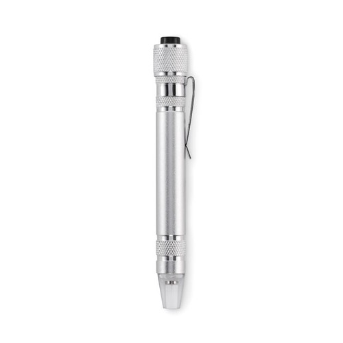 Outil multifonction en aluminium recyclé en forme de stylo avec lampe. Comprend 3 têtes de tournevis plats et 3 têtes de tournevis cruciformes. 4 piles bouton LR41 incluses.
