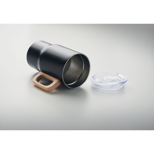 Gobelet à double paroi en acier inoxydable recyclé (90 % d'acier inoxydable recyclé et 10 % d'acier inoxydable) avec poignée en bois et ouverture coulissante. Capacité : 350 ml.