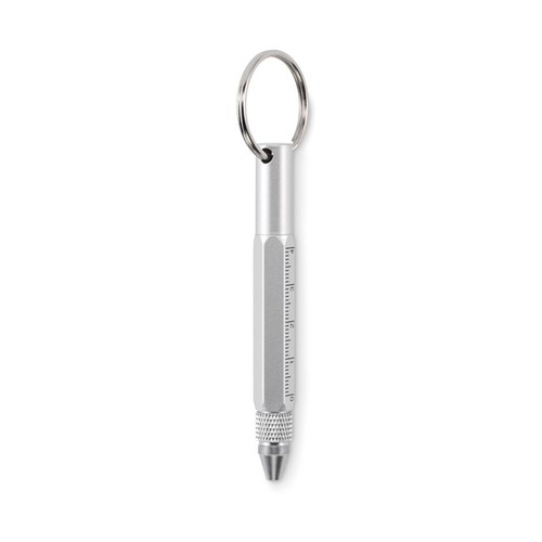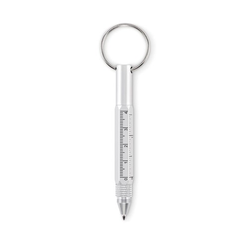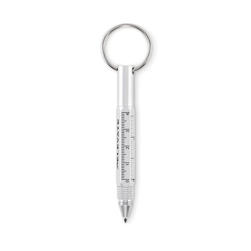 Porte- clés avec stylo twist en aluminium recyclé, règle de 4 cm et de 1,5 pouce, stylet et tournevis 2 en 1 à tête plate et cruciforme. Encre noire.