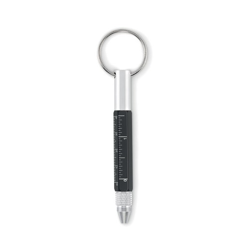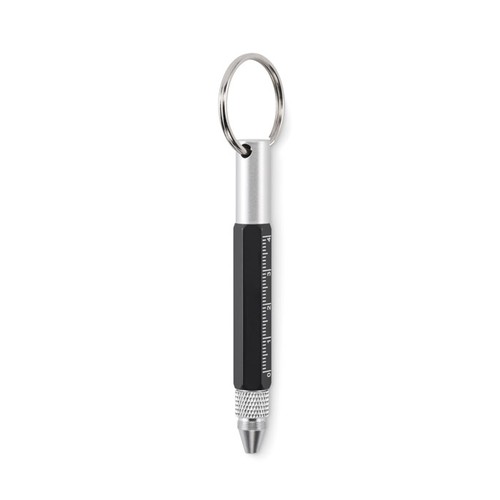 Porte- clés avec stylo twist en aluminium recyclé, règle de 4 cm et de 1,5 pouce, stylet et tournevis 2 en 1 à tête plate et cruciforme. Encre noire.