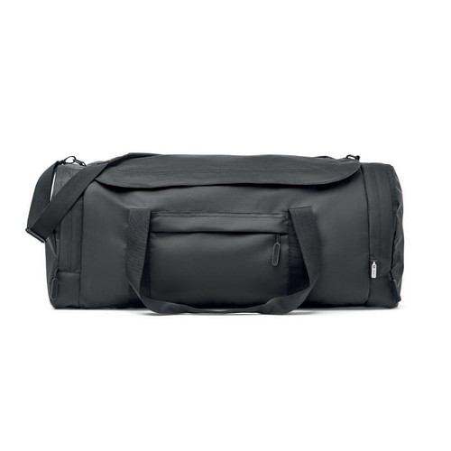 Grand sac de sport ou de voyage en polyester 300D RPET. Compartiment principal avec poches latérales zippées dont une isotherme. Renfort de fond amovible et bandoulière réglable, amovible.
