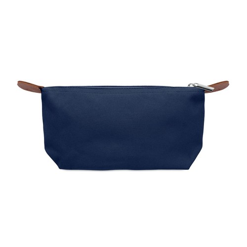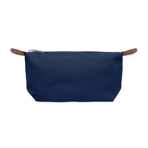 Trousseà cosmétiques en polyester 600D RPET avec fermeture à glissière sur le dessus et détails en PU marron.