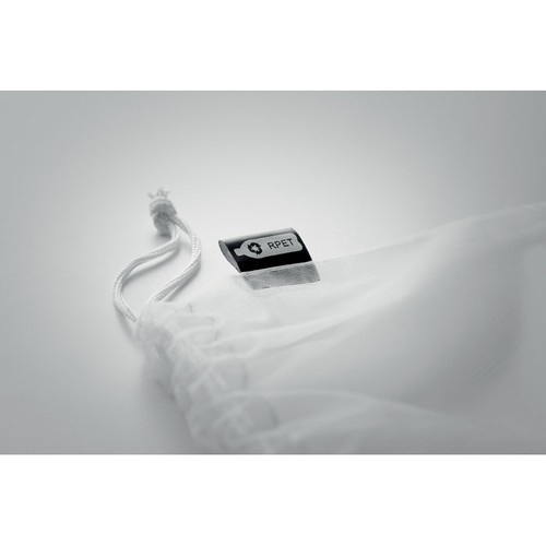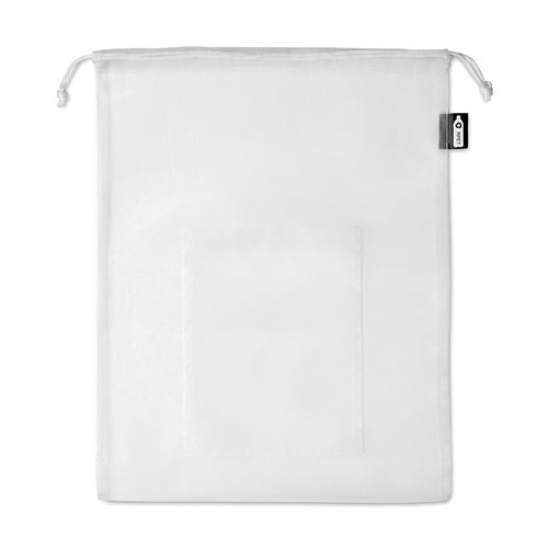 Sac à provisions en filet RPET avec poche frontale et cordon de serrage en PP blanc sur le dessus.