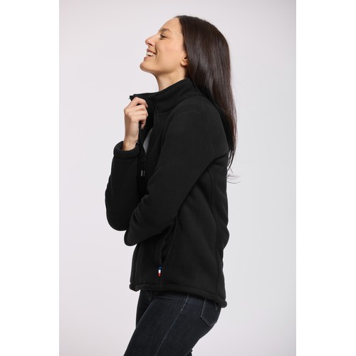 Veste polaire 410 g/m² Made in France. Extérieur : 100 polyester dont 30% de polyester recyclé. Manches longues, coupe droite, 2 poches mains. Détail tricolore sur la couture latérale bas gauche.