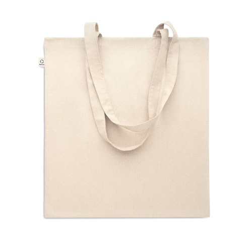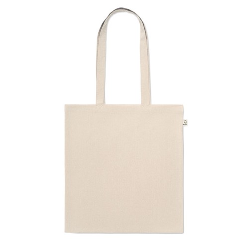 Sac shopping en coton recyclé pré- consommation (70% coton recyclé et 30% RPET) avec de longues poignées. 140 gr/m². Cet article peut rétrécir après avoir imprimé.