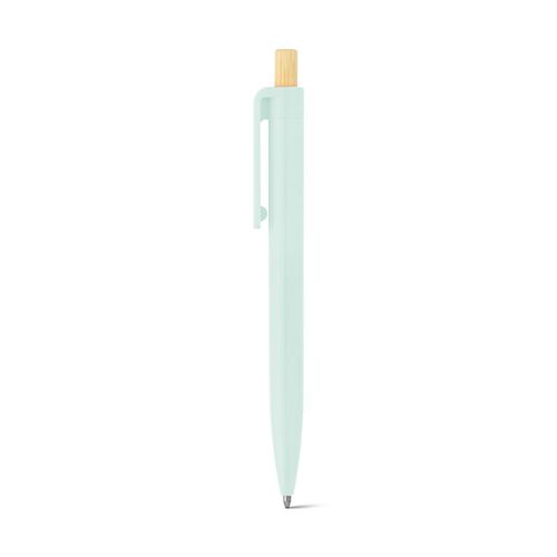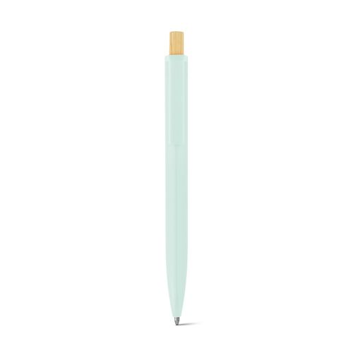Stylo à bille en ABS recyclé (100% rABS) avec bouton en bambou. Encre bleue. Le produit étant fabriqué à partir de matériaux naturels, la couleur du produit ainsi que le résultat de l'impression peuvent varier d'un produit à l'autre. ø11 x 134 mm