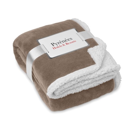 Couverture en polaire de 200 gr/m² avec doublure en polyester sherpa de 220 gr/m². Enveloppée dans un ruban et carte imprimable.
